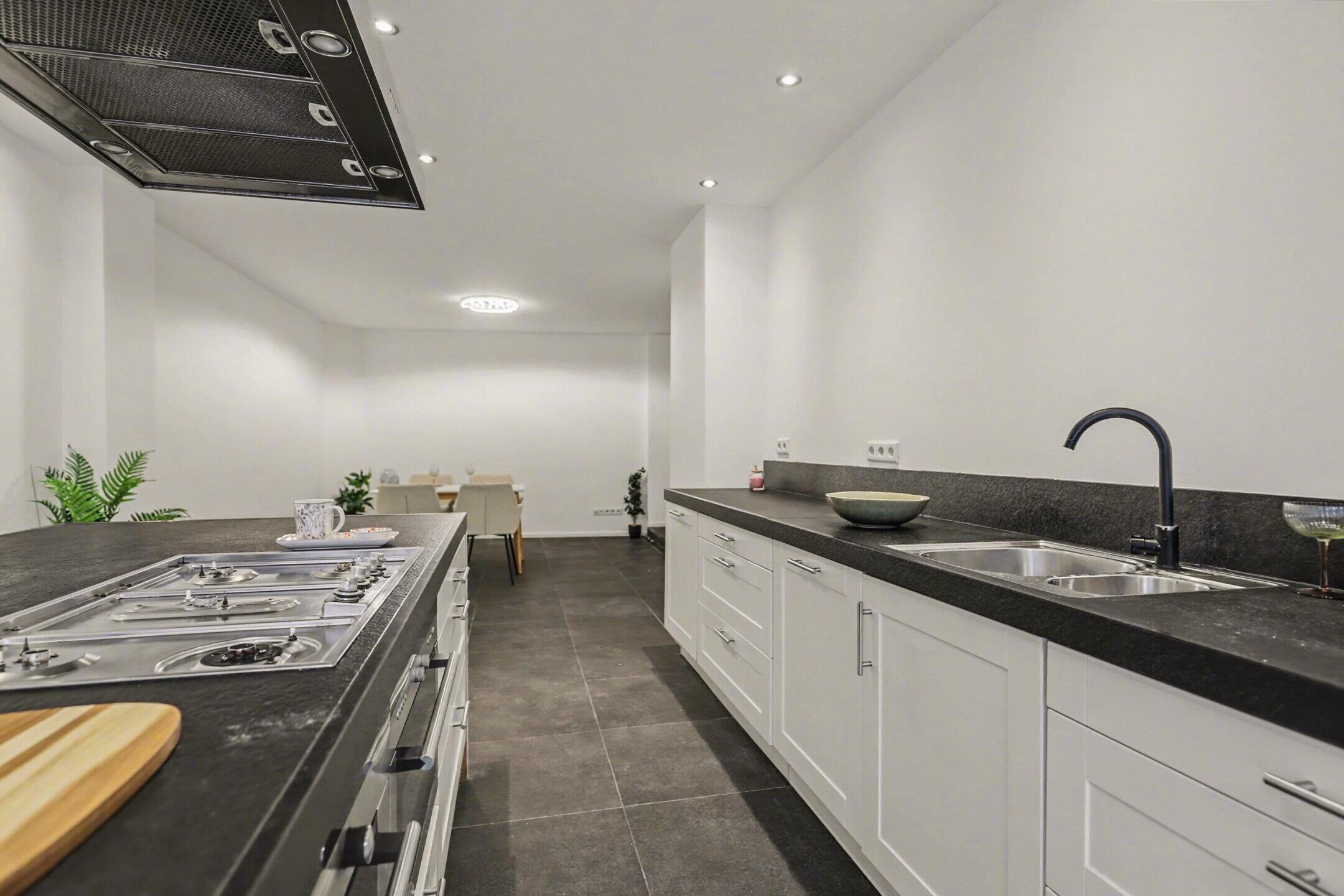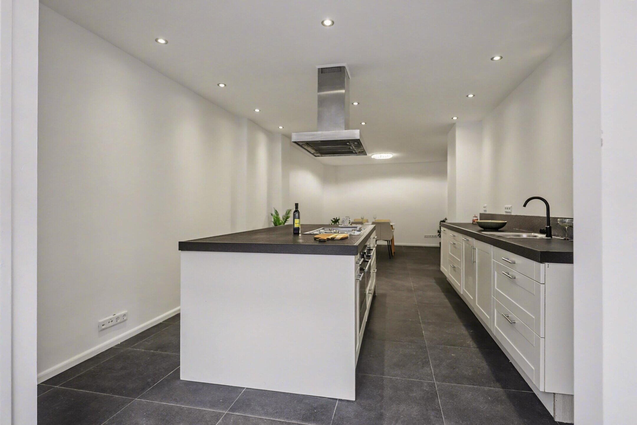 Aan de achterzijde bevindt zich de eetkamer met aansluitend de keuken, die voldoende ruimte biedt voor een kookeiland of uitgebreide opstelling.
