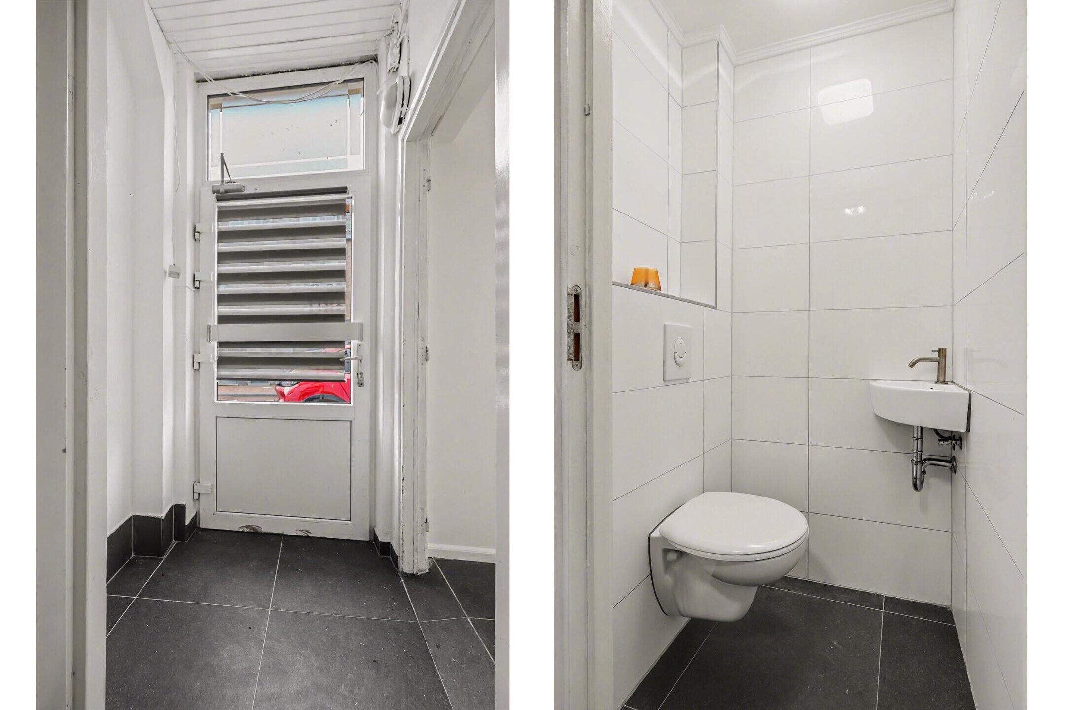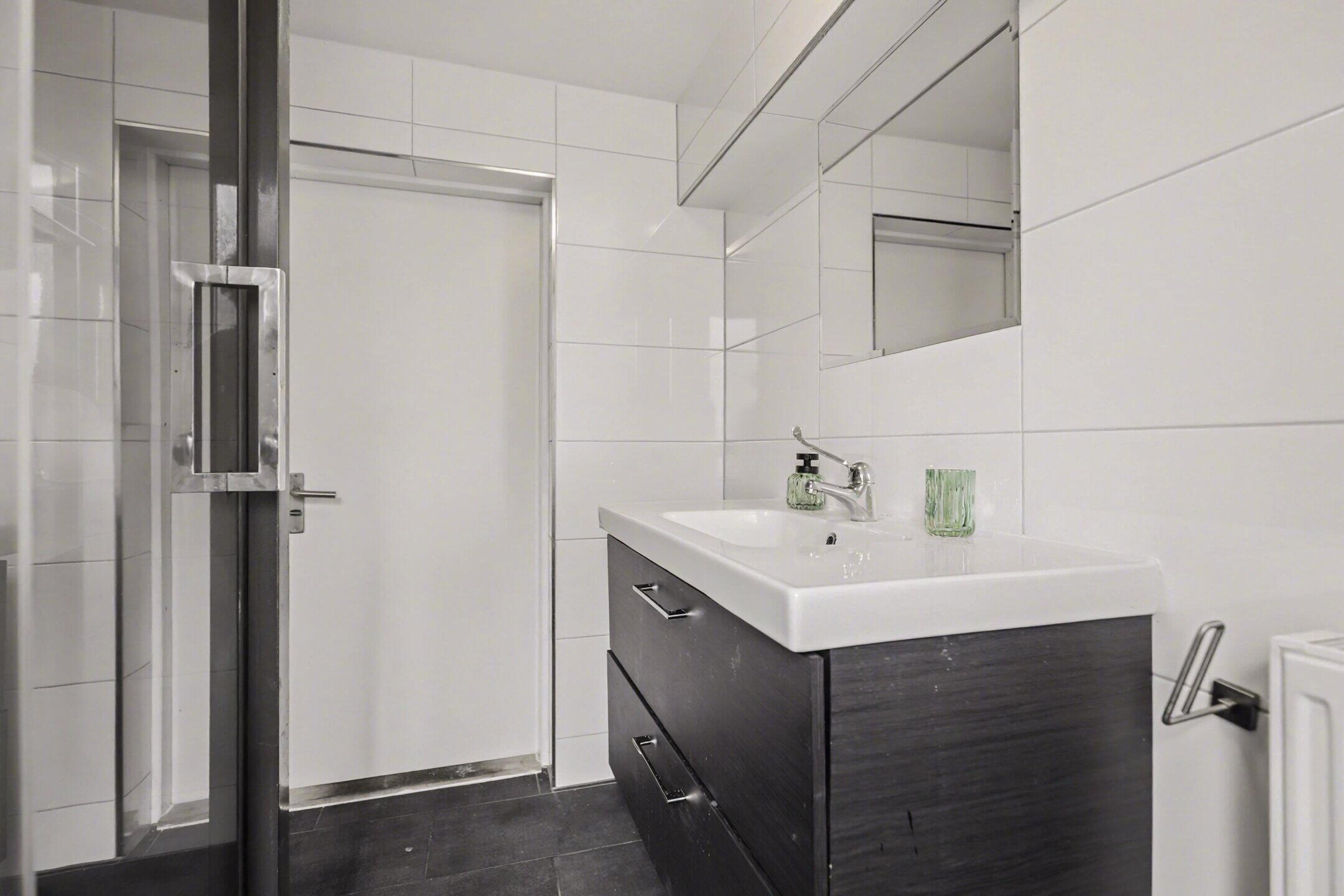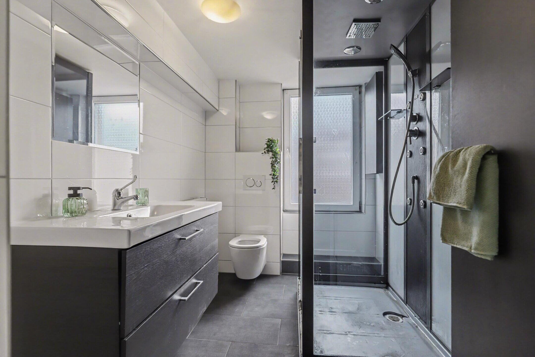 De badkamer is centraal gelegen en voorzien van douche, toilet en wastafel.